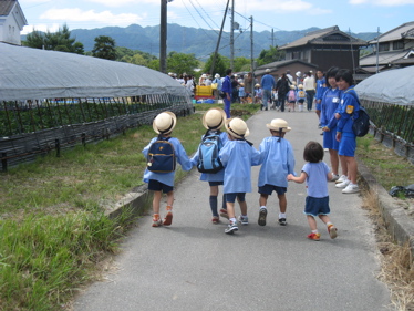 After the greenhouses were thoroughly picked over –it didn’t take long with lots of hungry kids and moms– we returned to the veneer sheets to eat the lunches that the moms had brought. Shortly after lunch, and catching a few frogs in the nearby water troughs, we headed back home by train. The video below shows Owen and three of his buddies playing the very-familiar Japanese game of “paper/scissors/rock”. Owen, as you can see (on the right), doesn’t seem to care about winning as much as doing scissorsover and over! But he’s so happy to know how to do the game.