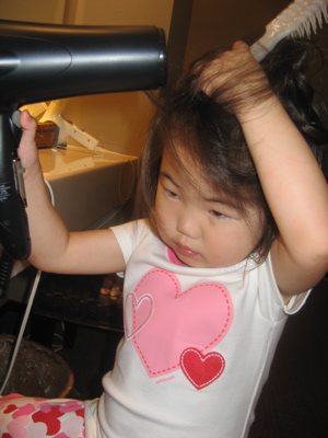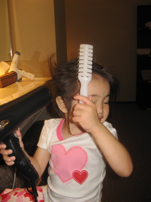 I had the two girls, and after coming out and getting pajamas on, there is a room containing large mirrors, blow dryers, brushes, lotions, etc. where women can primp and get ready to go back into the real world. We have discovered that Annie is quite the primper (Now really – should a 2-almost-3-year old already be a primper??) First she had to blow dry her hair…then clean her ears, then put on lotion…It takes her longer than me… Here are a few photos: