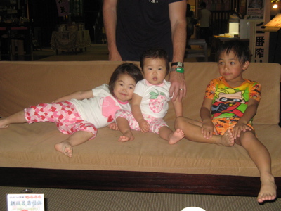 Since Monday is our day off, we decided spontaneously yesterday late afternoon to pack a picnic and go to the park. On our way home, after dinner, the kids started chanting, “onsen!” “onsen!” (= hot springs). This is one of their favorite places- the hot springs public bath near our home. We consented, and stopped home to grab towels and pajamas and went and enjoyed soaking in the hot baths outside and inside (naked, segregated by gender, of course).