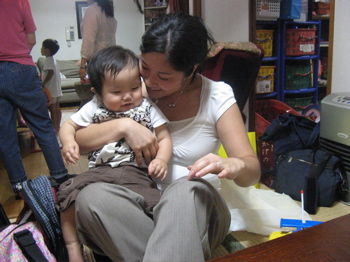 Last night we had a fun and festive birthday gathering at our home for two close friends, Megumi (pictured above with Olivia, photo taken by Owen!) and Claire (with the chips and mango salsa). Megumi (Mimi, as our kids call her) is a tent-maker English teacher who lives about 45 minutes away, and has been our friend for 8 years or so. She is like family to us- she often spends the weekends, and has provided babysitting services on occasion so we can get out. Claire- is one of our co-workers, and I am sure that our children have no idea that Auntie Claire is not really closely related, because she and her husband Bobby are very much part of our family. For real.