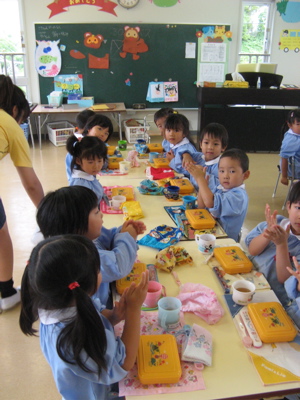Then, we carry boxes containing smaller lunch boxes to each classroom, where the children are waiting at low tables and chairs, with their individual lunchmats, cup, and chopsticks laid out in front of them. (Owen is in top right)