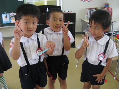 No lunch ladies (except for bandana mamas). No lunch rooms. (No pizza on fridays!) But it works. I continue to feel like our experiences at kindergarten give us so much insight into Japanese culture. From early on, Japanese children are taught order, cooperation, submitting to authorities, doing many rituals in certain, prescribed ways. Eric saw a documentary on Japanese preschool that explained that all Japanese children learn the exact method of how to take a bath, including scrubbing order and methods. Just like Owen is learning how to “do lunch.” And it works! (Owen with his buddies, after lunch, is on the right).