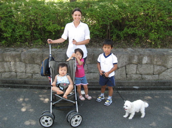 3. Yesterday, I felt so much joy despite sitting in some Osaka traffic. We were going to pick up our friend Laura at the airport. Laura called us last week and asked if she could come and spend some time with our family. Last year, she had come as a mother’s helper for a month or two. She became like a sister and dear friend to us. Her arrival yesterday has already revived my heart; the way that she lives her life with ease and with love is a gift to our family. Here she is helping me walk the kids and Molly to an event at Owen’s school this morning: