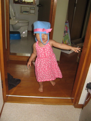 Lately Olivia (18 months old) has gotten into dressing up. She finds whatever she can, and finds a way to wear it: