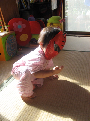 It’s not Halloween yet, but she’s into her brother’s Power Ranger mask: