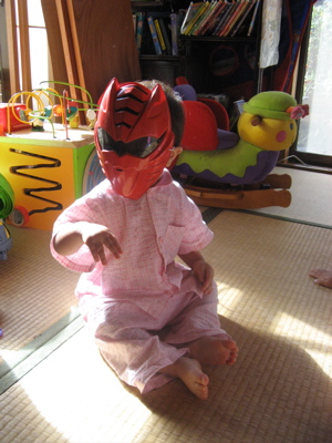 It’s not Halloween yet, but she’s into her brother’s Power Ranger mask: