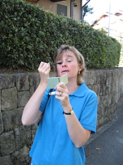 Finally, you’ve all heard about women who drive to work and put mascara on in the car….well, my sister Beth topped that one. I made them hurry out of the house so we wouldn’t be late, and this was the scene as we were walking down our street to the school: