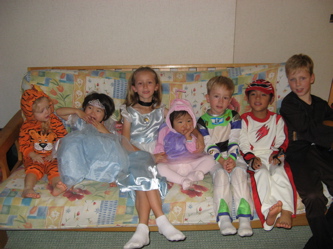 Owen, Annie, and Olivia had two chances to wear their favorite costumes this Halloween season…on Monday night we had a little house party with our friends the Thomsons. Our collective seven children dressed up, and had to come find the adults hiding in different rooms (we need to be creative with American holidays!). Fun was had by all:
