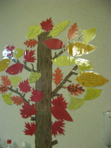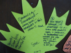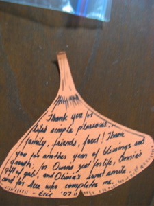 And – we did my favorite Thanksgiving ritual…. the thanksgiving leaves. We started four years ago with a simple idea I found in a family magazine. Each person wrote down what they are thankful for that year on a paper leaf, and we went around and shared these and then hung them on a string…we have done this each year, and laminated the paper leaves afterwards, last year making them into a thanksgiving tree. The leaves continue to spread…and its fun to look back over the past years and remember friends who have been with us and what God has been doing in our midst.