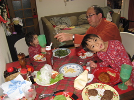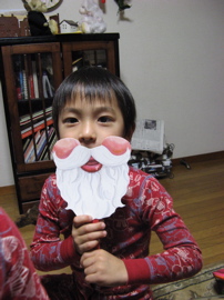 On the night of his real birthday (12/12), all the kids took a bath before dinner while Eric was at a meeting, and then we had hamburgers, fries, and green beans– all of Owen’s favorites — and a kampai (toast) with dinner. After dinner, Owen opened presents from us and family members…The Santa beard was from Auntie Beth… He went to bed with the basketball from his Uncle Marky!
