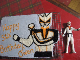 What was our cake? It was Owen’s choice (though he seemed surprised- and very happy – to see it the next day!) – it was “Gekki Chopper” – the latest Japanese Power Ranger figure. Here he is (after a few hours, the cake started to seem like a real person… around 2 am a person I was rather sick of :))