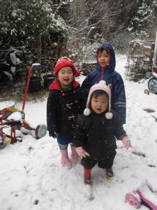 Eric had to go and teach his men’s class, so mid-morning I pulled out all the snow clothes, bundled all 4 of us up, and we walked up to the park and met Owen’s school friend Yousuke, his younger brother, and mom Naomi. We all had a great time…