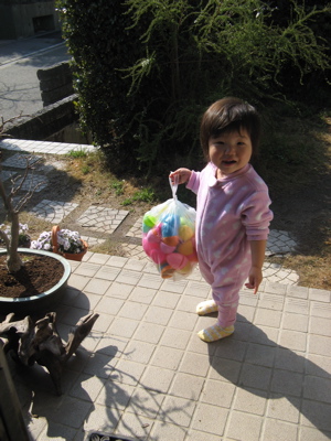 There have been things that we didn’t realize were lost that we found in the places Olivia placed them… the chicken consomme in my shoes by the front door; my hairbrush in Owen’s backpack; our spoons in a coat pocket. You get the idea. (Below- Olivia escaping in her pajamas with the plastic Easter eggs).