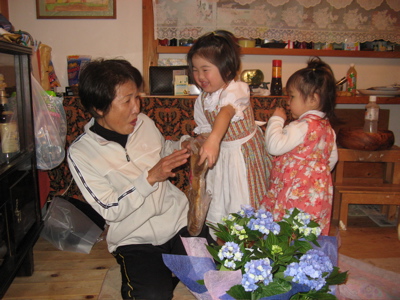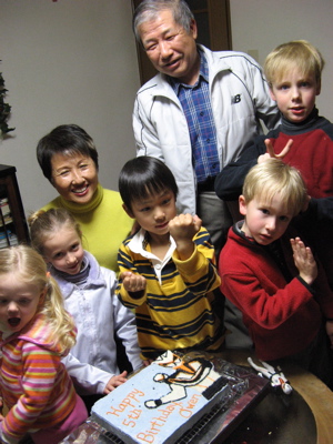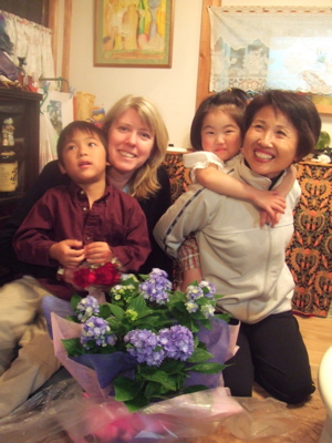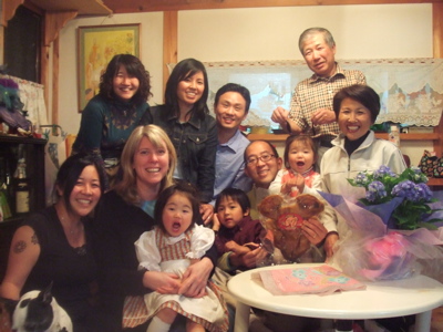 And that dance was the beginning of an amazing friendship between our two families. Their daughter, Y., has become one of our dearest friends ever. She is at our home once or twice a week for a meal, movie, or just to hang out. And Mr. and Mrs. I. are very much our children’s grandparents in Japan. Our family birthday celebrations and holidays always include them; on grandparents’ day at Owen’s school Mrs. I rode Owen on the bike and made him feel like a million dollars. Mr. I has a special soft spot in his heart for our girls — and they love hanging out with him, and the 3 dogs and 4 cats at their home! We can’t tell you how much we love this family.