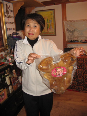 Then, it was time to give her the REAL gift. On a recent trip to Okinawa, we had bought a gift especially with Mrs. I. in mind. We had it ice-packed, and kept it refrigerated until this dinner party. Annie and Olivia gave it to her, and as she was opening it we told her this was a special gift to comfort them in their upcoming move to Osaka…