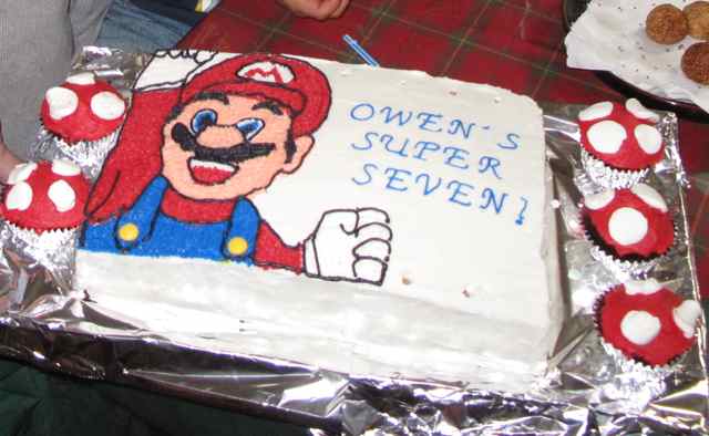 and then it was cake time! With Eric’s help I made a Super Mario cake, surrounded by “mushroom” cupcakes.