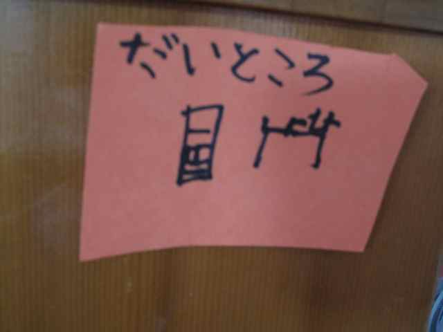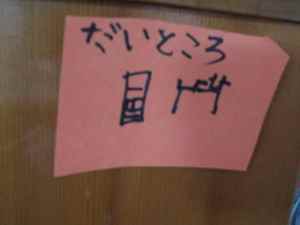 Owen wanted to have a Super Mario Brothers theme (if you don’t know who Mario is, like I didn’t until a year or so ago, ask any boy 5 years or older!)… He was SO SO excited! Two hours before the party he made signs all over the house (in Japanese) with labels for each room. (Below: toy room; kitchen)