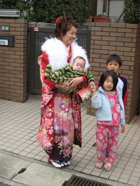 Our next-door neighbor, celebrating coming of age day and looking so beautiful. (I was so scared that he would spit up on that kimono!):