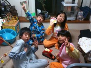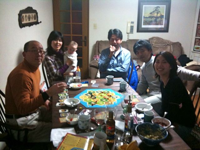 Meanwhile, in addition to enjoying a Mexican spread of fajitas, guacamole and chips; and ceviche, the adults all played Settlers of Catan. It was our first time to have to teach it in Japanese –poor them! But they were great learners and we had a really fun time. You know that we are in Japan when Eric and I tried hard not to win (we were the hosts; we taught them the game!). We actually could have won 2 rounds sooner but tried to wait it out, in vain, for one of the other couples to win. When we won, it was with the promise of a rematch in the near future. They were all very comfortable staying at our home until 11:30 at night! Our kids, of course, were thrilled, and thought it was New Year’s Eve again. Can’t wait for our next dinner/bathing/Settlers night with these fun friends!
