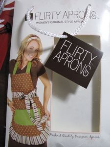 Eric bought me the funnest gift while he was in Utah two weeks ago — an apron. But not just any apron — it’s a flirty apron. It’s awesome! I have become quite the apron housewife (keeps me from changing a few times a day while cleaning the kitchen, cooking, feeding a baby, etc.) This is one apron really fun to wear.