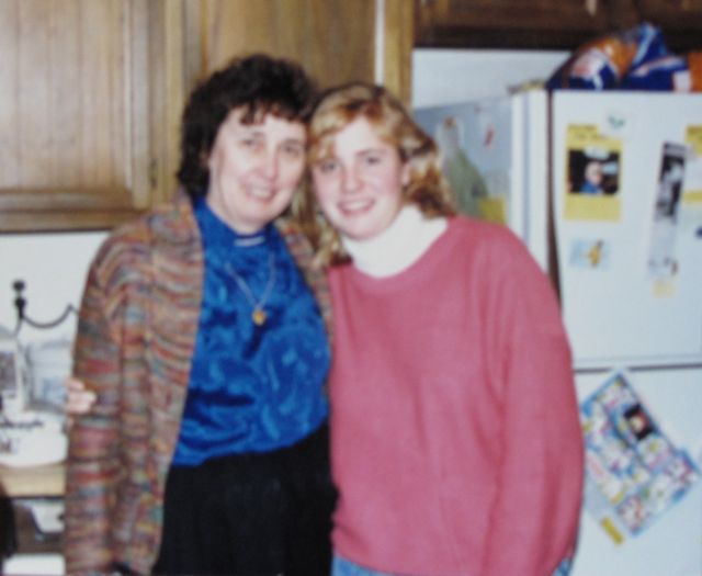 Whenever I do make this recipe, it brings back warm recipes of my mom.  She’s been gone for twenty-one years, but her recipes, and her legacy, lives on.  Of course I had to serve it with corn and rice — Plumb family style… and I thought about the countless dinners we helped her serve with countless number of guests around our dining room table.  But at the time our guests didn’t feel countless, I don’t think…They each felt special and a part of the Plumb family.  She was so good at including people into our family and our lives.  Our house didn’t need to be perfect (for sure one thing I inherited from her, for better or worse)… often guests came at short notice, but she and my Dad worked well together in sharing a heart for hospitality and loving people.  I love it when I call one of my sisters and they are preparing for guests to arrive any minute… or the generous hospitality that each of them show to my family when we come home.  I know who they learned this from – even if the recipes are altered and our styles of entertaining all reflect our own personalities, how thankful I am today for my Mom’s legacies and her daily, loving investment in her four daughters.  I love it that I can keep learning from her. (Below- family portrait :)… and Mom and my sister Allison in her kitchen, which holds such great memories for many of us):