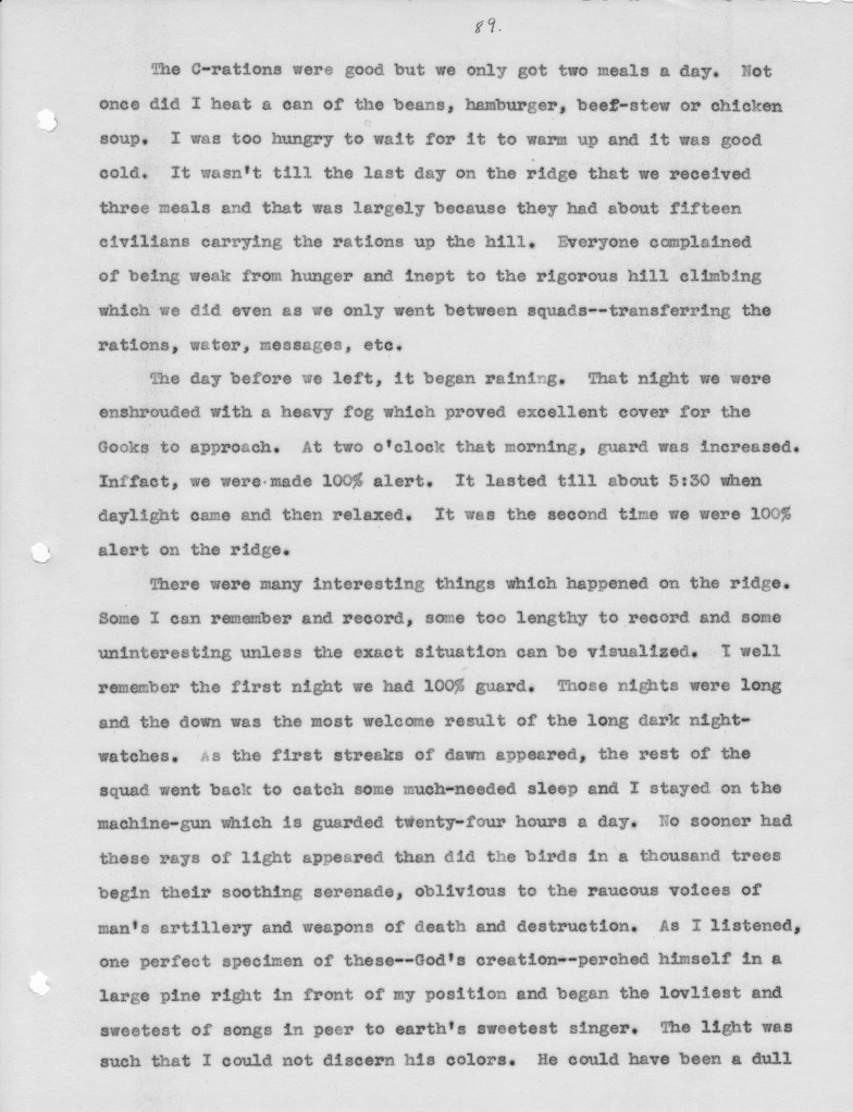 I wanted to share a short excerpt from his letters — pages 88 and 89. (Please forgive any references that reflect soldier language used sixty years ago during a war; the last paragraph cuts off and is not related to the previous entries). These words paint a wonderful picture of both the challenges of a soldier in that war as well as the perspective that we can choose to have when we are in the midst of any battles of life.