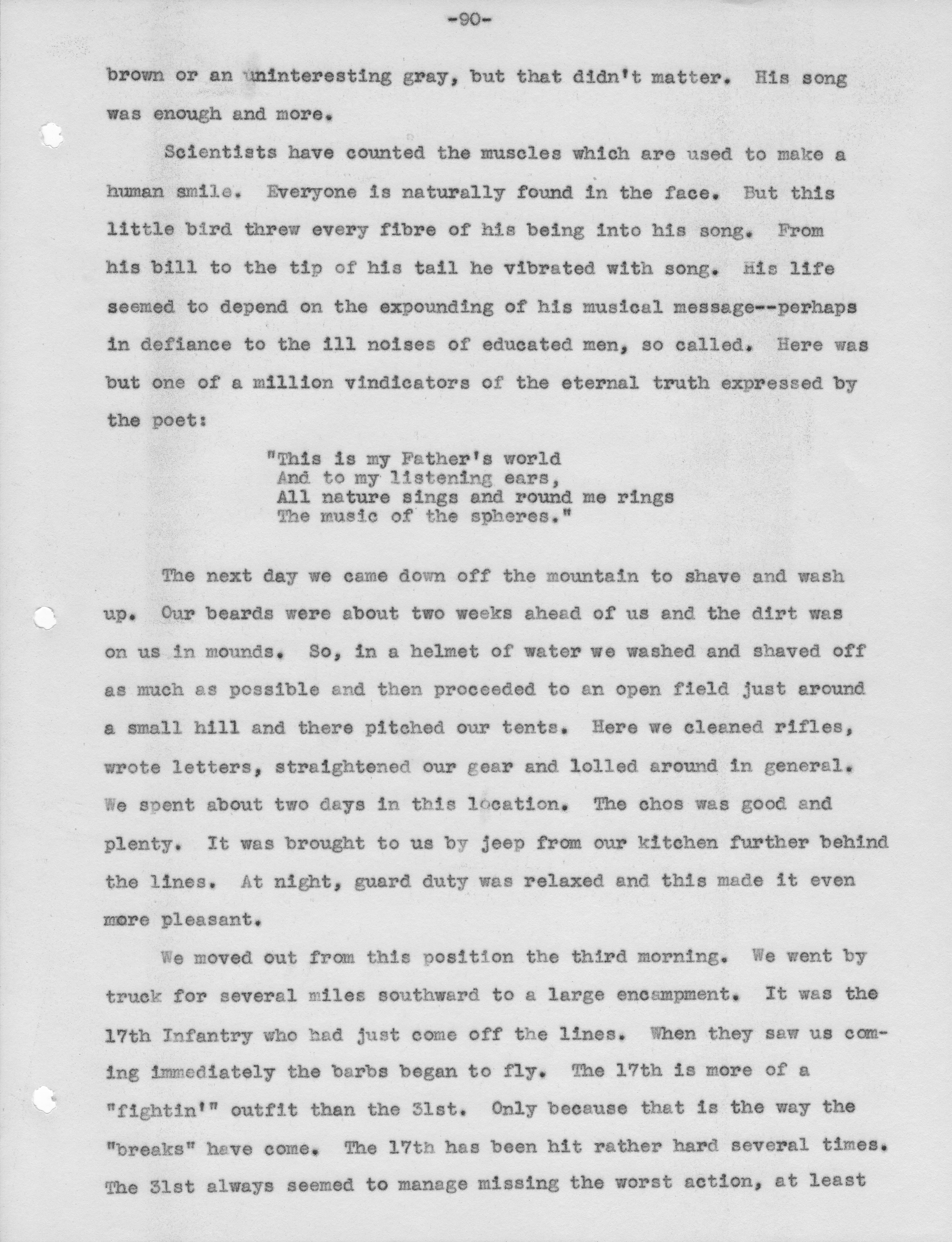 For some reason last week I stumbled across one of the pages and couldn’t stop reading until I’d read to the end. It had been a long time since reading it. (I remember in 7th grade when I had first found the binder I talked to my social studies teacher about how to get it published. I was serious about it!). Reading it again, I was so amazed by this man. I read each page with renewed respect for this soldier– who even in the midst of a crazy war noticed all the beautiful details of his surroundings. Who found reasons to praise God after seemingly senseless days and nights of marching up and down uncleared mountains and digging trenches in hard, rocky ground only to be told to move on quickly.