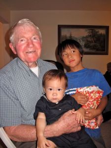 It was also great just before leaving the U.S. to have an early birthday celebration for him with my family two weeks ago. Here are some photos — with my Dad, affectionately known by his grandkids as “GiGi Bill”…