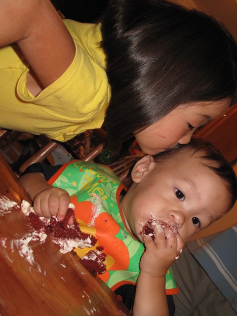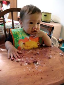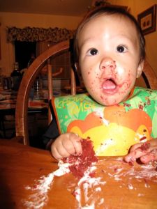 … and Ian enjoying his first birthday cake — the red velvet color made for an interesting mess. He went for it!