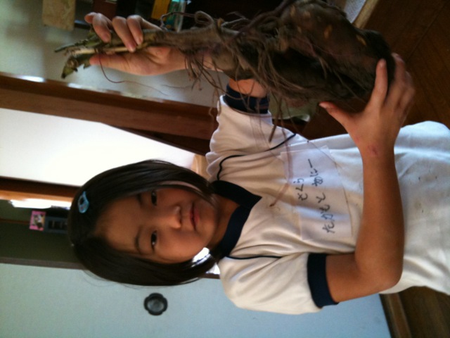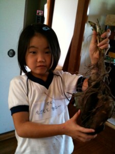 Today Annie went with her class on an important school ritual in Japan — imo-hori, or sweet-potato digging/pulling.  Owen missed getting to do this his last year of youchien (preschool/kindergarten) because we were in the U.S. that season;  we were glad that Annie could do this!  If you ask a Japanese to name food associated with fall, they would most likely say one of three foods:  persimmon (my personal favorite – blog here); chestnuts (my least favorite, but growing on me); or sweet potatoes.  She was quite proud of her pull, and spent a good 45 minutes scrubbing her eight treasures as clean as she could.