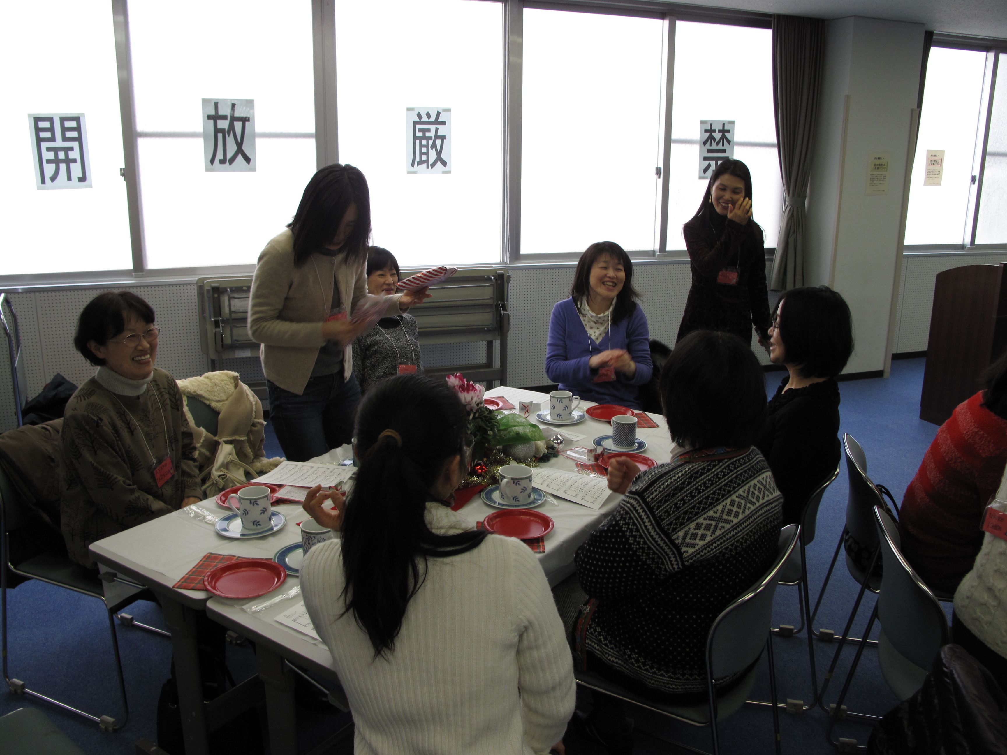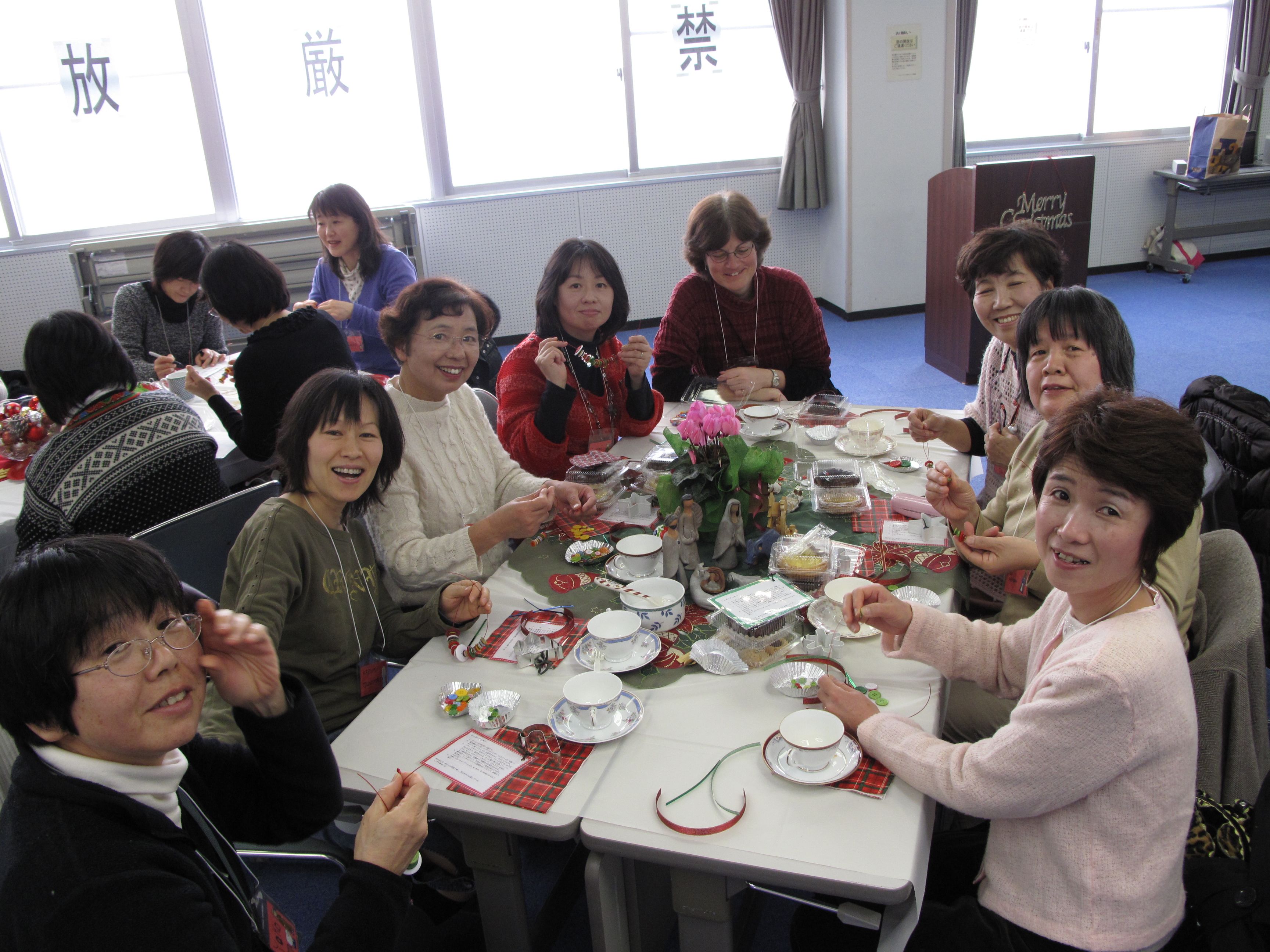 Our friends from CBC in Cerritos had sent us some great Christmas items to help make this tea possible –big bags of confectioner’s sugar (very expensive here for some reason) and American-style cookie cutters which became cherished doorprizes for everyone. Yuko and Rhonda made and attached laminated sugar cookie recipes with Isaiah 43:4 written at the bottom: “Because you are precious in my sight, I have loved you…”