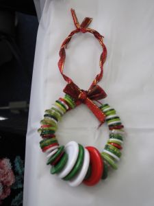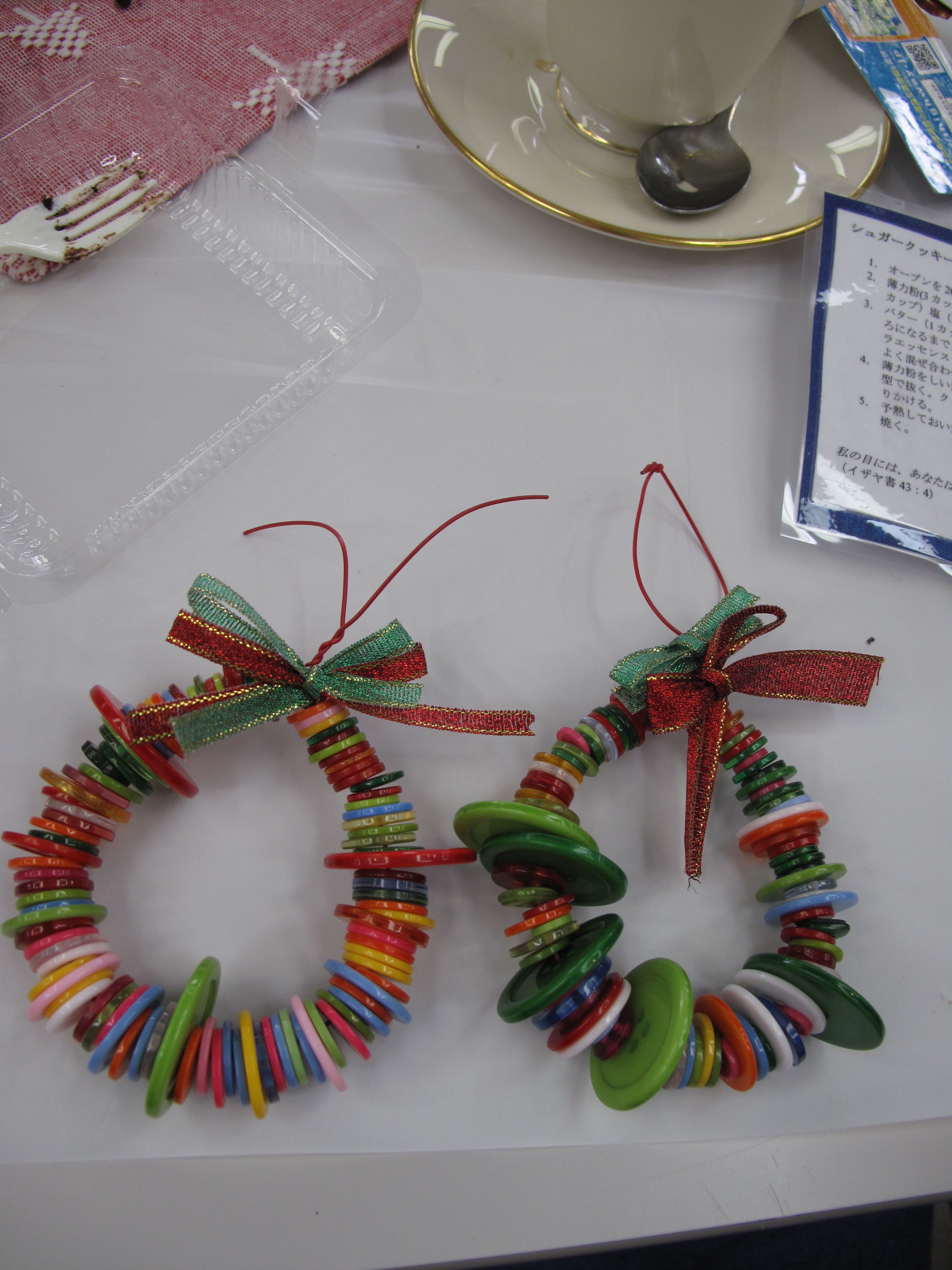 In addition to coffee, tea, pastries, and homemade christmas cookies, we made a fun craft, thanks to my inspiration Martha Stewart!— button wreaths. We had to order the buttons from the U.S. because they are so expensive here (five for a dollar is the cheapest) – so it was a fun treat for the ladies to make these.. (Personally, I think theirs were cuter than Martha’s – but please don’t tell her I said so.)