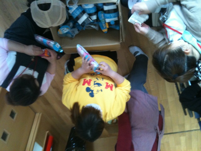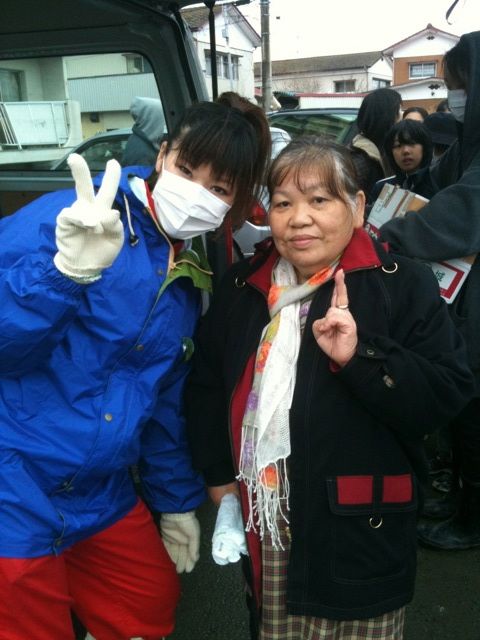 This woman (above right) was waiting and when she got to the front realized she wasn’t going to get very much. Maya (left) is a karate champion who lives locally but has been helping out the teams. She is a student at the dojo where the team is staying. Maya had the bag of scarves, and offered one to the lady. She picked one out, still looking unhappy, and she wrapped it around her neck. Eric said she broke out in a wreath of smiles and said, “Atatakai!” … “It’s so warm!” She left with the scarf, and a smile.