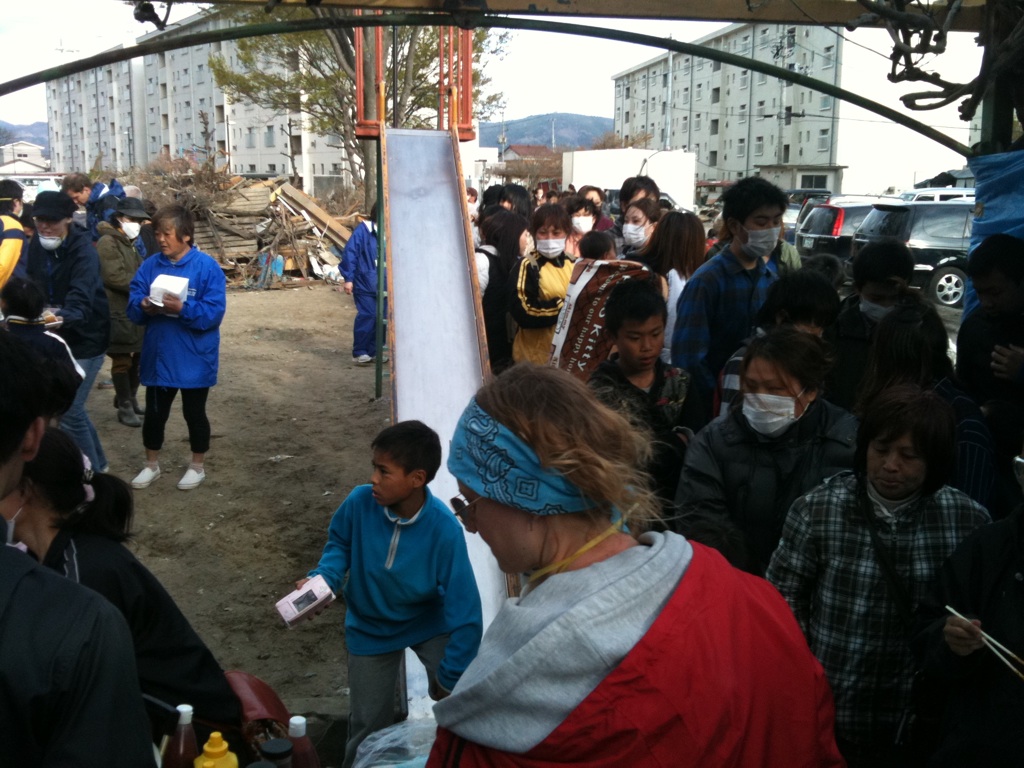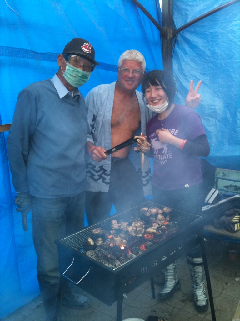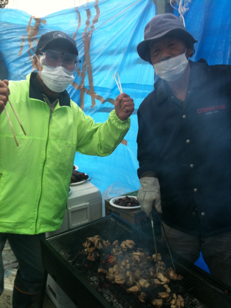 Eric called late tonight and said it was an “absolutely amazing” day. There were high winds, so the team was praying about whether to postpone or not. Eric talked to Aoki san (see previous entry) who is one of the leaders in the apartment complex. He said please don’t cancel it – many people are excited about it, and most of us haven’t had cooked meat since the tsunami. So they made the decision to go ahead with it.