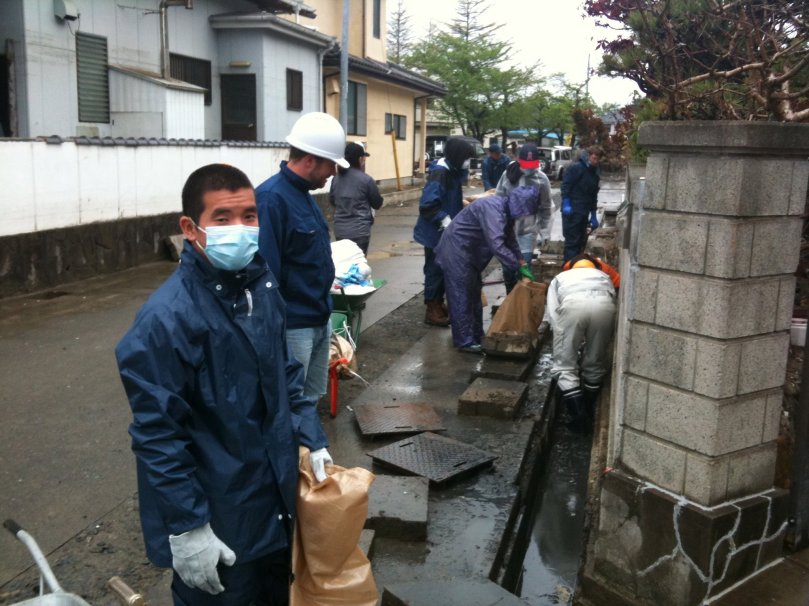 The photo below (taken by Peter) shows the team at work this past weekend. The lines on the home in the background show where the tsunami water SETTLED – above the first floor. Last night Nozomi was describing this day to me. As they were cleaning out the gutters in front of these homes, they discovered it full of human excrement. Probably for the month or two without water and electricity, families needed to dump their “stuff” somewhere….and probably hoped that if they put it in the gutter it would go away somehow. It didn’t! The teams were careful to wear masks, gloves, and carefully wash all their clothes. (Eric is in the blue and black behind the purple raincoat). They managed to get those gutters clean and dispose of the nastiness!