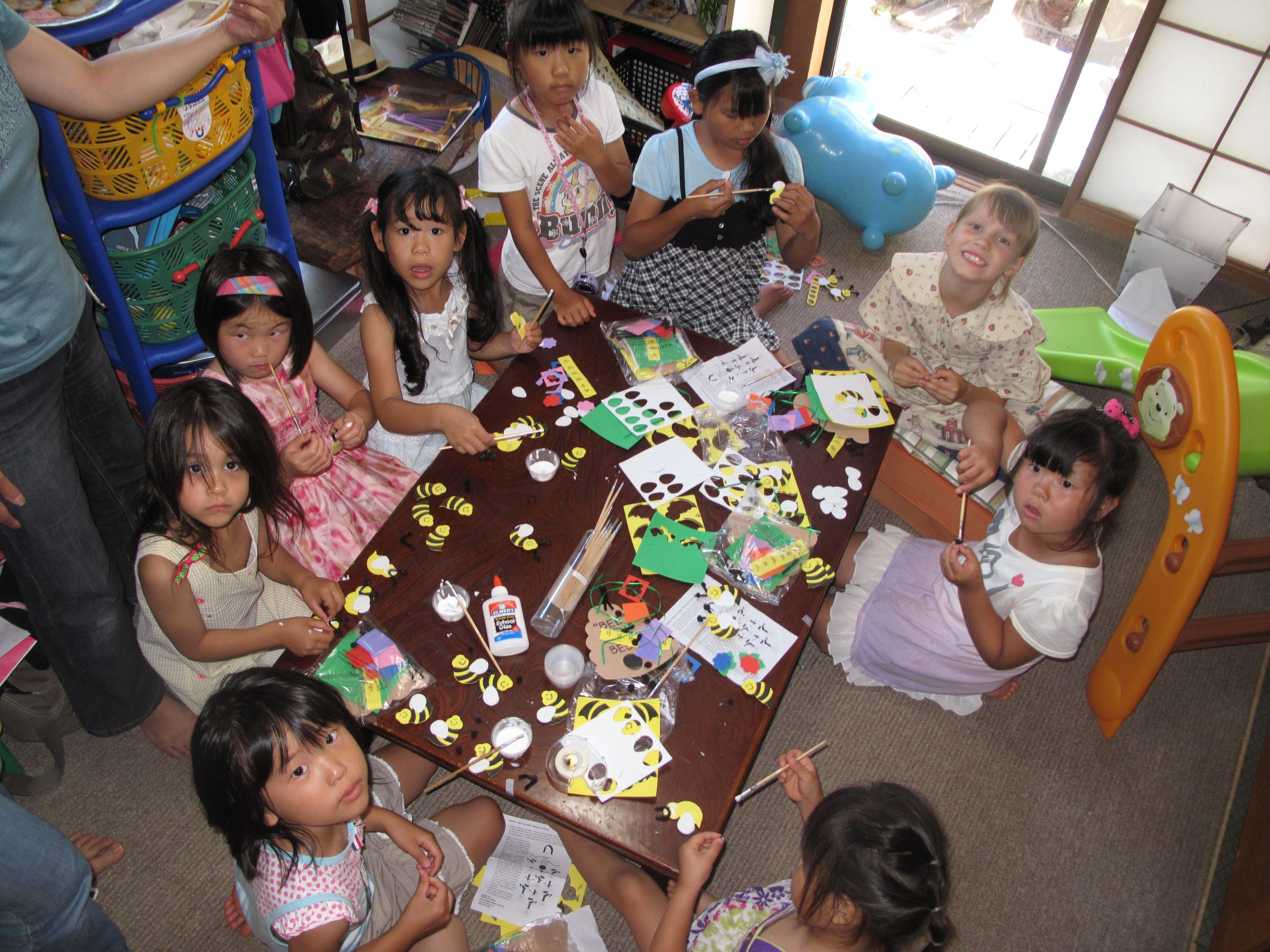 We are still recovering from Annie’s first “girlfriend” birthday party yesterday! Just before she graduated from japanese youchien/kindergarten, her class had done a play taken from last year’s full-feature anime about the life of a bee, called Mitsu Bachi Hachi. Since February, she has wanted a “bee” themed birthday party, so we had a bee tea party (a week before her real birthday because next weekend is busy with other school/travel events). This was the first time she has had a birthday party that was for her friends, and not just a few families we are close to who gather to celebrate her. We invited eight girls, but with moms, some siblings, a dad and an aunt, we had around twenty-five here over the course of the afternoon. One family ended up staying longer and joined us for a simple spaghetti dinner.
