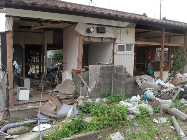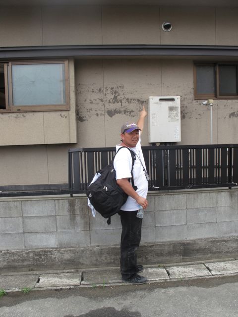 The areas of Ishinomaki where we are working were hit by the tsunami coming in and for the most part destroying the first floor of most of the homes. For some houses, this meant totally destroying their home. For others, they are still living on the second floor while trying to restore somehow their first floor. Joseph below is standing in front of a house with an obvious water line.