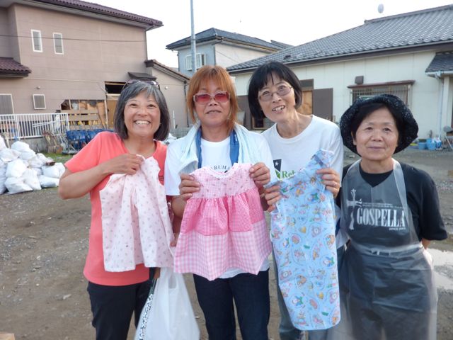 Sharon had a patient from Hawaii make about 75 children’s dresses and outfits for her to bring. It was so fun to give them away! Mrs. Baba, below, got these for her granddaughter. The first day we had gone around the neighborhood to tell people about the bbq and see if they needed work down. She reluctantly shared the need to take apart two rooms in her first floor that had been tsunami-hit. A large crew went in the day of the bbq while we were preparing and did an amazing job. She was so thankful! As she talked with our friend Yumiko, she shared that her husband left her and their three boys six years ago. She said what was most difficult after the tsunami was that he never called to see if they were alright. She cried, and Yumiko prayed for her. She had found people who really care for her.