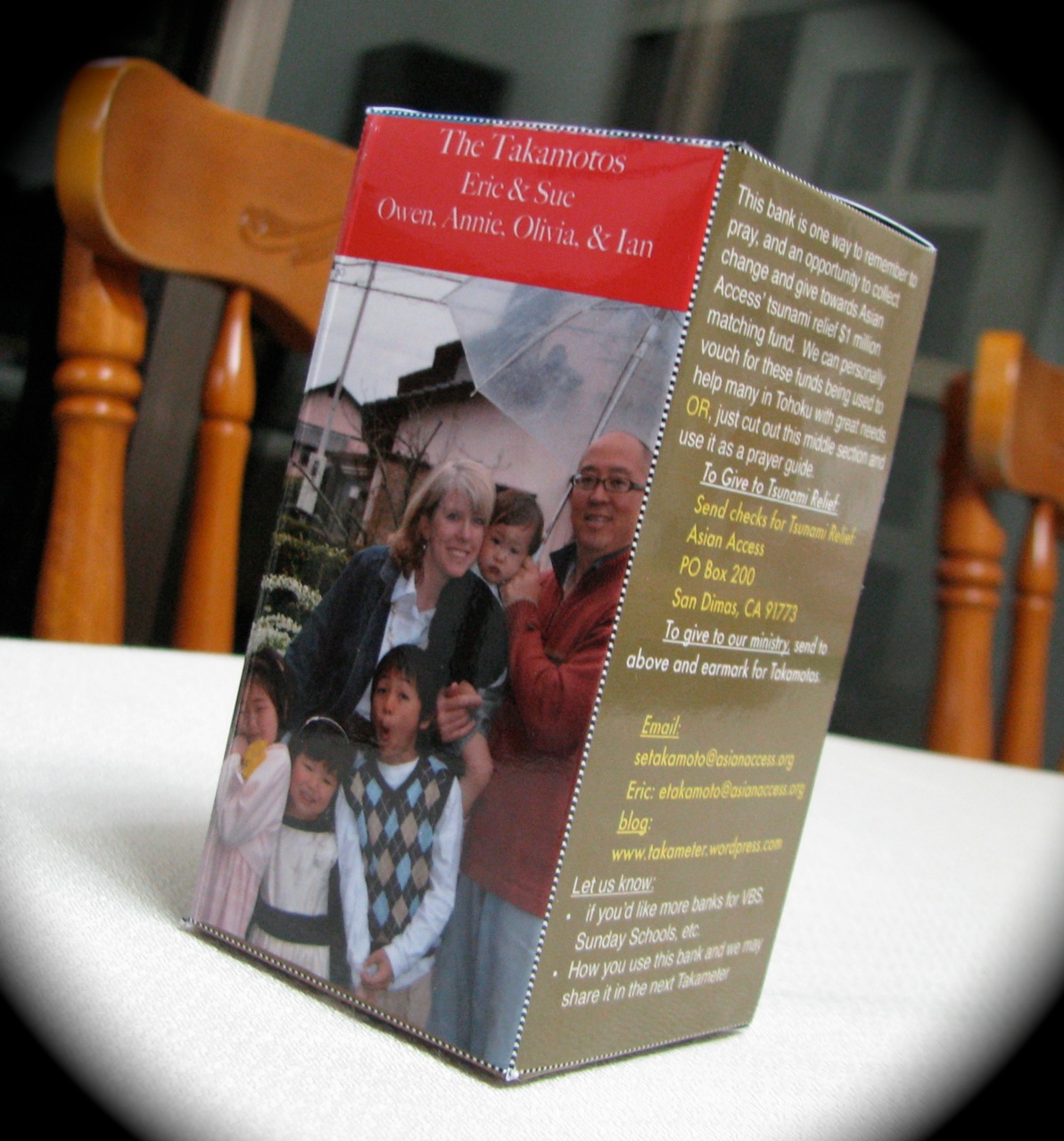 We recently sent out an 8 1/2 x 11 laminated card to our family and friends that can be cut and folded to make a bank — for those who would like to save spare money to give to tsunami relief. One of the very real concerns is that as the media stops coverage of the needs in Tohoku, the still-needed volunteers and giving from the U.S. will dissipate as well. Our friend Gary, who had originally designed the bank, just sent us a photo of our tsunami relief bank put together. Hopefully this will inspire some of you to put yours together! (Note: for the faint of heart you can just cut out the middle section and use it as a bookmark or on your fridge).