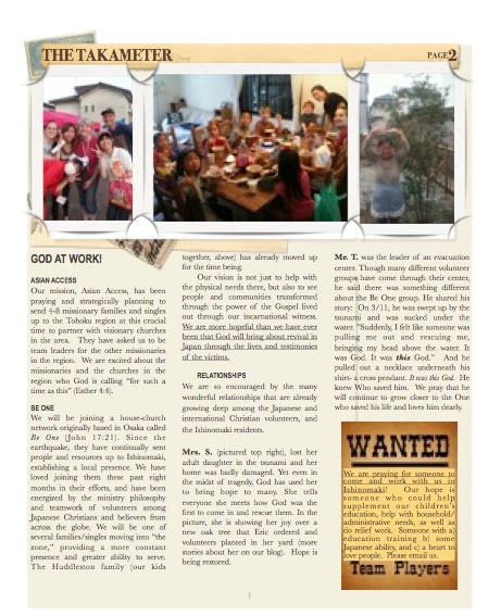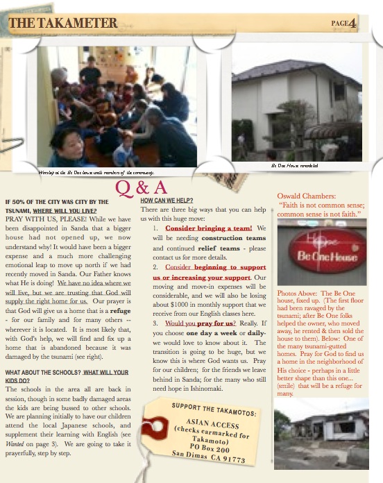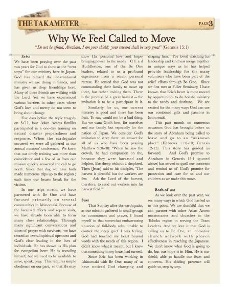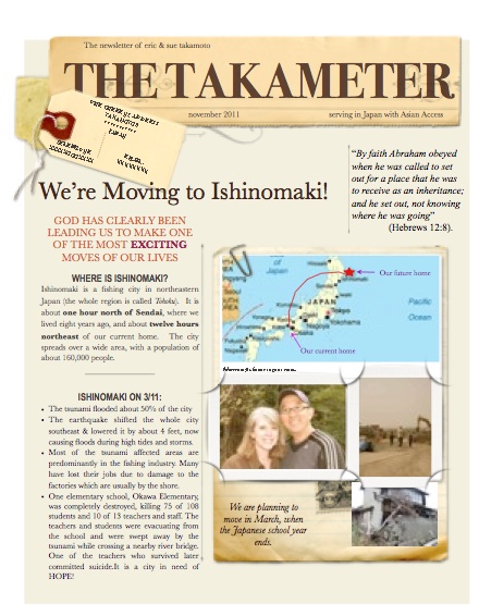 Attached is the newsletter that we have sent out this past week announcing our move up to Ishinomaki, in the Tohoku region. We’ve made it web-friendly for our friends who don’t receive our letters- and left out some info that we don’t want floating on the web. (If you’d like to get our newsletters, send us an email with your address and we will be sure it include you in future mailings).