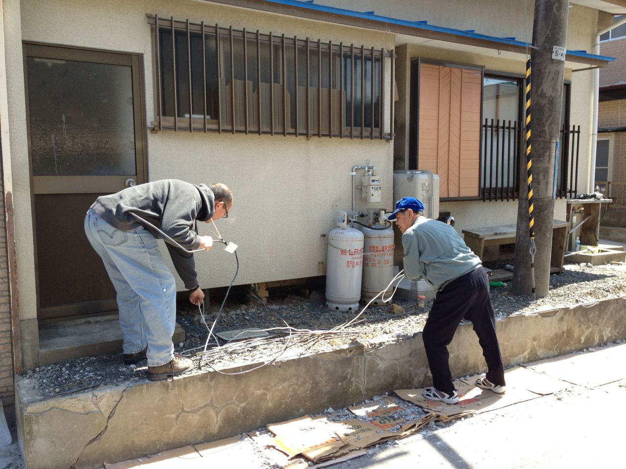 Mr. K.and his wife are moving in with their sister, who lives next door to our temporary home here. He had asked Eric if a volunteer team could help take out the cement wall that had been splintered by the earthquake yesterday. On Friday, a team of volunteers from Tokyo came over with Eric and spent the morning take out the wall. here is Eric working on it: