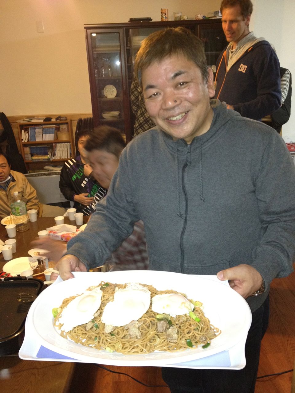 Most Saturday nights we do a community meal, inviting friends from the community to come in and eat together. Tonight, several members of the Osaka team prepared and cooked the meal- it was great! In addition, two men came who own a Japanese noodle factory in Ishinomaki… back in the early days right after the tsunami Be One volunteers were taking bottled water and food around, and they were able to get some needed supplies for their family. Tonight, they brought a bunch of their yakisoba noodles, and then ran out to the store and bought meat and veggies and made it for us all. It was great! I guess that Ishinomaki style in part involves serving cooked eggs on the top.