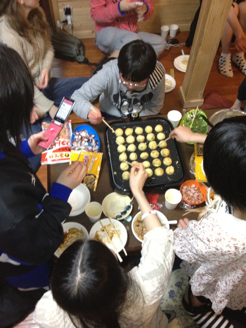 We also made takoyaki, or octopus dumplings…. There were a bunch of junior and senior high girls who came, and enjoyed helping out with the cooking.