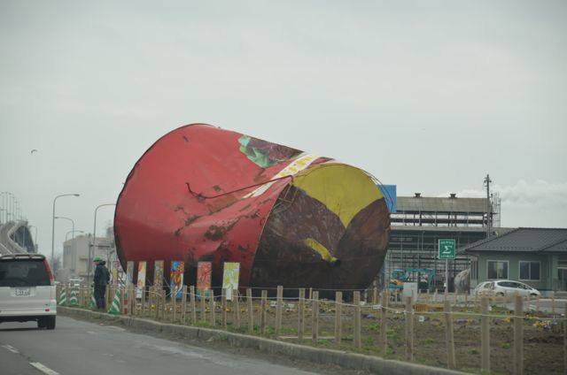 This is a 35-foot tall fish-oil tank that was swept over 1000 feet by the tsunami. Years ago it had been painted to resemble a can of whale meat, and had stood in front of the Kinoya seafood processing company. It is still where the tsunami dumped it a year ago — between two lanes of busy traffic. I hope that the city leaves it here as a memorial.