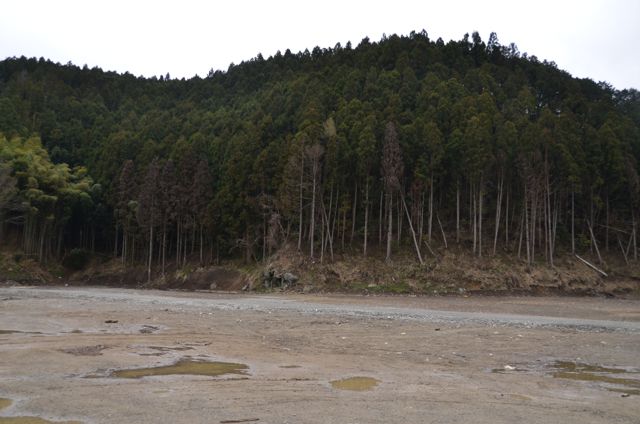And then we came to the bridge, that led us over to the school. This is a small town called Okawa, about four kilometers inland from the sea. One third of the bridge had been washed away in the tsunami (apparently by a 3-ton fishing boat that struck it hard at that time) – you can see the repairs that have been made; and then in the following photo what is left of the bridge still remains in the riverbed.