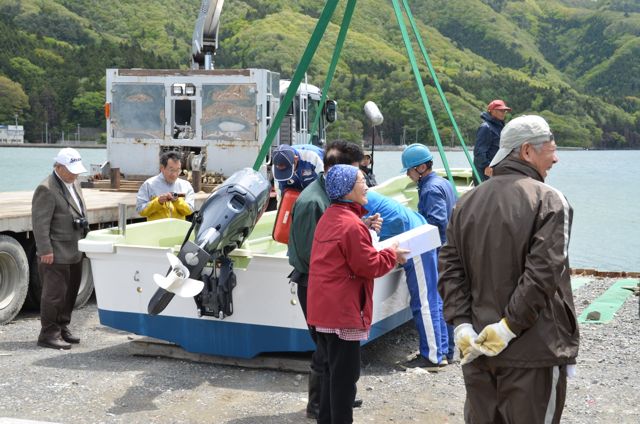 Yesterday many of our Be One team and volunteers attended a first – the dedication/christening (?) of an oyster fishing boat being put out to sea for the first time. It is significant because it is in an area that one NHK reporter described as the worst-hit area in all of Tohoku by the tsunami. This town has been so decimated that they are expecting it will be at least another two years before electricity and water can be brought in! The tsunami wiped out the livelihood of the region- oyster farming. One entire year has been lost for all of these fishermen; this winter they have slowly been able to start again. For many, though, they have not had the resources to replace their boats, nets, and supplies; some of course lost their homes and their work areas. Some Be One members and volunteers have been helping one of the local oyster farmers build a log fence. We all went to cheer as this family christened a new boat, signifying hope for the future for this family and also for this village.
