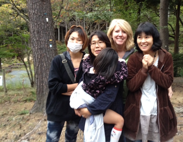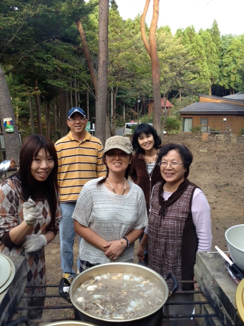 Yesterday we had a totally northern-Japan experience… we went with our Be One staff and Nozomi ladies and their families up the mountain and had an imonikai party. This is sort of a hot stew that you make over a fire with mountain potatoes, meat, and other veggies. We made two different kinds with the local tastes — the Yamagata prefecture flavor (heavy on beef and less veggies, pictured below) and the Miyagi prefecture kind (lots of veggies and pork with a miso base). I favored our current prefecture flavor, and our family enjoyed some Miyagi imoni leftovers tonight.