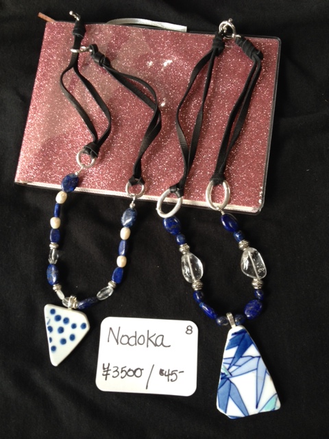 Our “signature” piece — made exclusively for the Shards of Hope collection — is called the Nodoka, named by Chi. for her sweet daughter with the broken bone! It is beautiful, like its namesake, and is on the high end because it features blue lapis stones and moonstones which accent the blue and white pottery that is prevalent here.