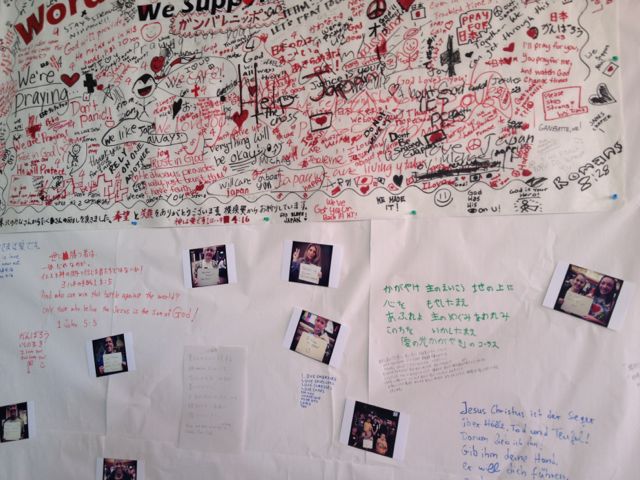 Today, 3/11, we have felt the burden and the privilege of walking with our Ishinomaki friends through the remembrance and the pain of two years ago. We are thankful for so many who have joined across the world to pray with us. We posted messages and photos today up on the wall for everyone to see — amazing reminders that Ishinomaki is not alone!