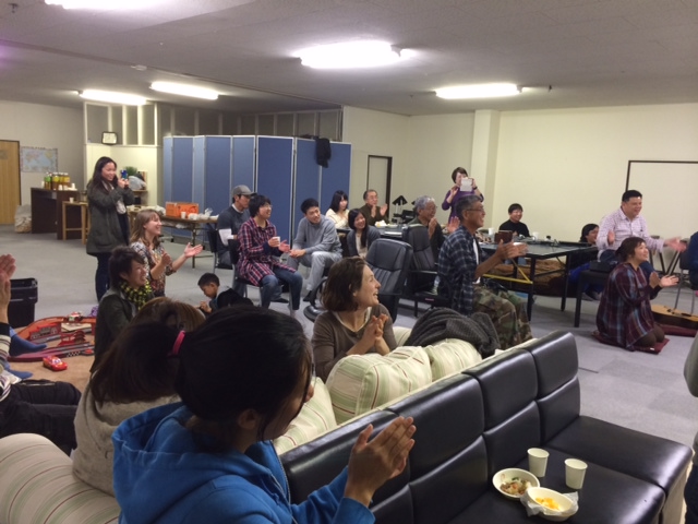 Tonight we had a last minute dinner gathering hosted by the team from Singapore that is up here with us for three days. We invited our friends and their families at the Nozomi Project, called a few regulars, and prepared for the possible maximum number of guests we could imagine — 60. (With just our team, kids, and current volunteers, we have close to 40!). The Singapore team, led by their member Chi who is a chef by trade, made a Singapore stew for us that was really delicious. And between 6 and 7 pm, A LOT of people came through those doors! The last father and daughter guests who came quite late ate the last of the stew. Before them, there could have been 70 or more who had a hot bowl of delicious Asian cuisine.